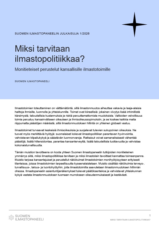 Tämän muistion tavoitteena on koota yhteen Suomen ilmastopaneelin tutkijoiden monitieteinen ymmärrys siitä, miksi ilmastopolitiikkaa tarvitaan ja miksi ilmastolain tavoitteet kannattaa toimeenpanna. Muistio tarjoaa kansantajuiset ja perustellut näkökulmat ilmastotoimien monihyötyisyyteen erityisesti tilanteissa, joissa ilmastotoimien tarpeellisuutta kyseenalaistetaan. Muistio sisältää näkökulmia terveys-, turvallisuus-, talous- ja luontohyötyihin, joita ilmastotoimilla saavutetaan ilmastonmuutoksen hillinnän ohessa. Ilmastopaneelin asiantuntijanäkemykset tukevat päätöksentekoa ja vahvistavat yhteiskunnan kykyä vastata ilmastonmuutoksen tuomaan murrokseen oikeudenmukaisesti ja kestävästi.