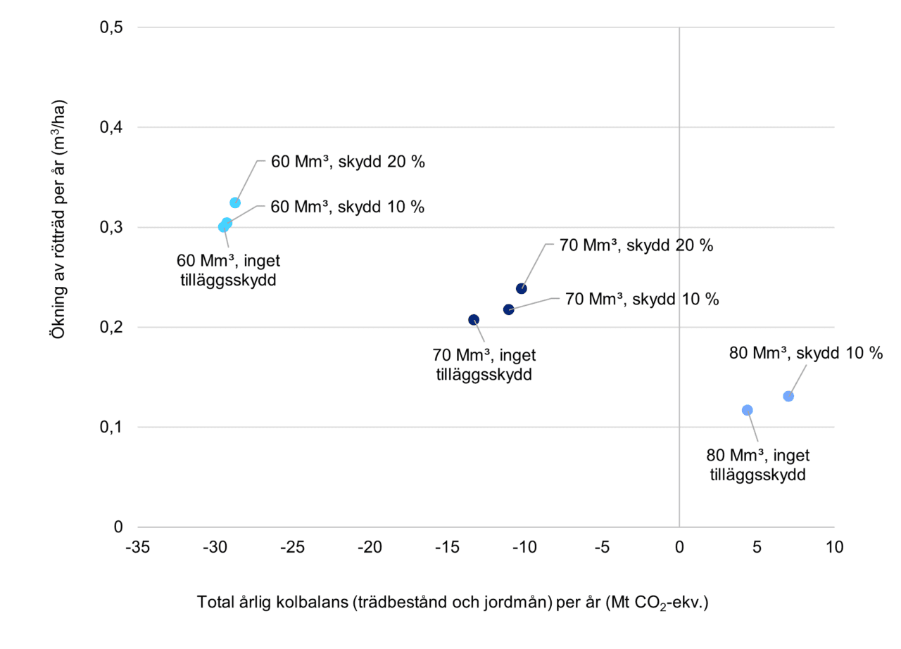 Skogarnas totala kolbalans utvecklas så att den blir gynnsammare med tanke på klimatet ju mindre skog som avverkas. Detta gäller under hela granskningsperioden på 50 år. Dessutom är det lättare att utvidga skyddsarealen och öka mängden strukturella drag som är viktiga för den biologiska mångfalden – rötträd, derbholz och lövträd – i ekonomiskogarna när avverkningarna är färre än i nuläget.